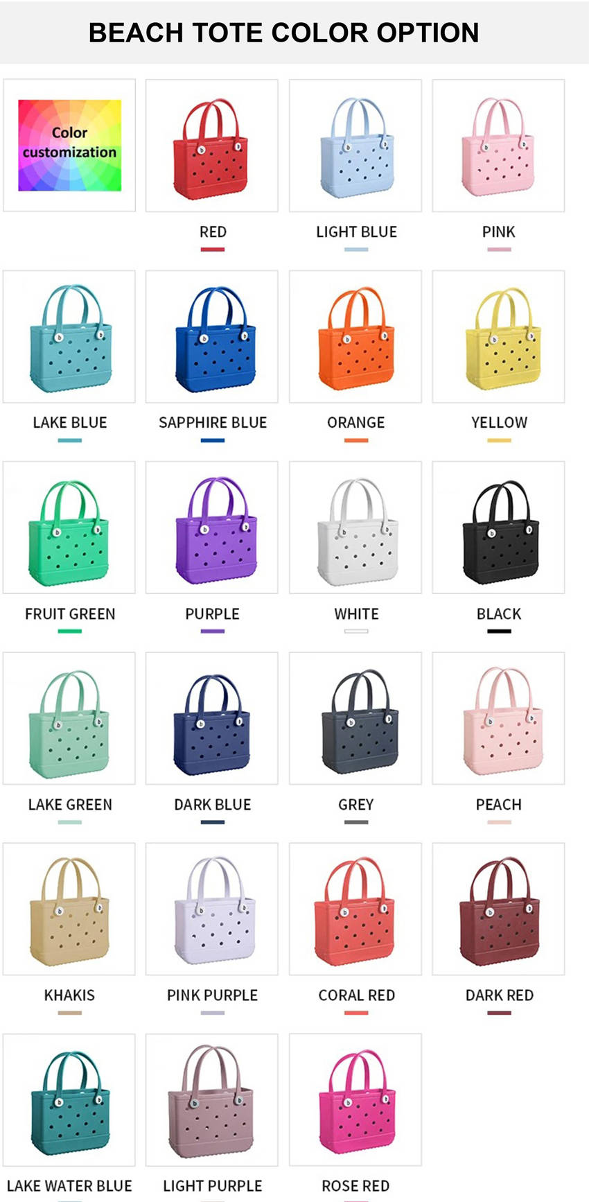 Risposta A: La nostra produzione copre un'ampia gamma di dimensioni, garantendo la possibilità di soddisfare le diverse esigenze dei clienti. È possibile accedere a informazioni dettagliate sulle dimensioni disponibili delle borse da spiaggia corrispondenti a ciascun stile tramite il nostro team di vendita dedicato.